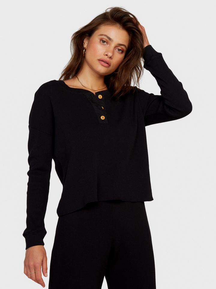 The Elliot is a relaxed fit crew thermal, featuring front placket and buttons, rib cuff on sleeve and five thread detailing throughout, made with a super soft Organic Thermal.