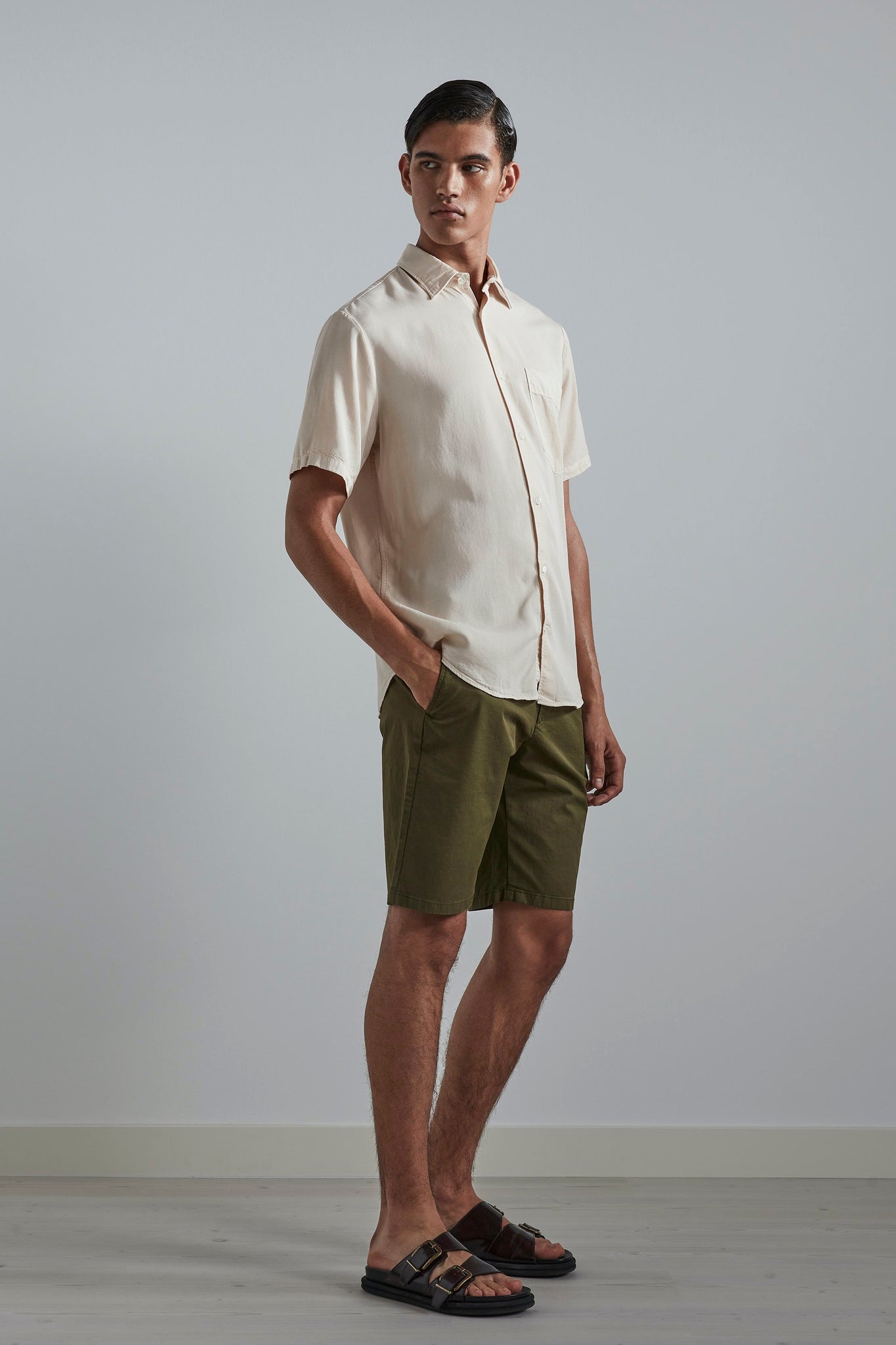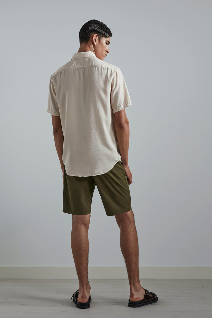 A classic shirt, cut in a straight silhouette with minimal detailing. Made in a smooth TENCEL™ Lyocell and garment-dyed, giving a faded patina to the garment.